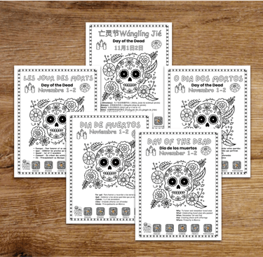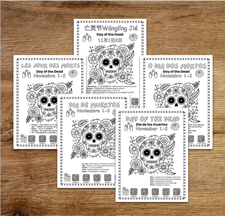 At the end of the page, you’ll find key points about Day of the Dead (access our free LULUTOM Library to choose your printable in the language your family is focusing on). Each language option includes links to videos about Day of the Dead, so everyone in the family can watch and learn in the language of their choice. You’ll find the printables in the FREE RESOURCES section of the site—a perfect activity for children to color as they learn about this special tradition.