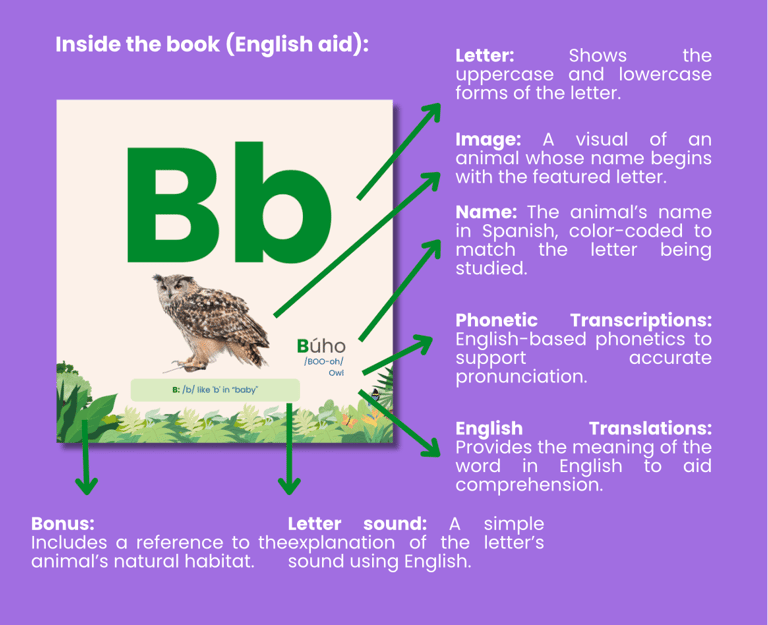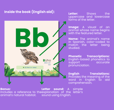 The Spanish-only version is designed for those already familiar with Spanish phonics, while the English-support version includes phonetic transcriptions and translations to assist English-speaking parents (see letter presentation below).