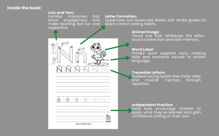The Mastering book in the LuluTom Spanish Read and Write Series focuses on building confidence through repetition, tracing, and hands-on writing practice. Designed for young learners who are ready to strengthen their skills, this book offers a clear, focused approach to mastering EL ABECEDARIO—(The alphabet in Spanish), with optional Spanish support.